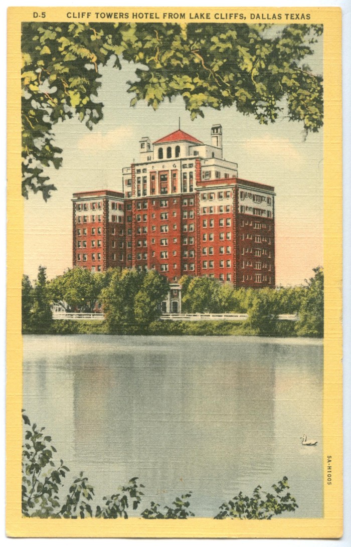 The photo shown above is of a 50-ish Charles Mangold cradling a bottle of whiskey at the ground floor bar of the Jefferson. Nine years later Mangold would erect a second major hotel, the Cliff Towers Hotel, overlooking the Trinity River, shown below on a postcard view.