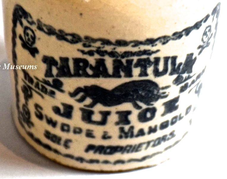 Among Swope & Mangold’s most inventive labels was the whiskey they called Tarantula Juice. It featured a heavy black label featuring skull and cross-bones and the large black image of a tarantula, large and often hairy arachnids belonging to the “Theraphosidae” family of spiders. While the image was not the most enticing around, the name probably captured an audience from Dallas’ drinking population.